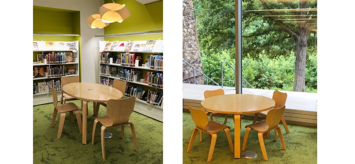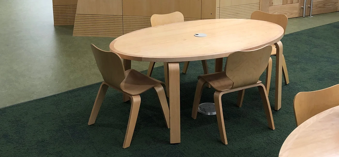 The Children’s room interior has biophilic qualities, from the moss green topiary fabrics on our Whistler Modular Lounges to the organic shapes of our Plover Child Chairs. The wood veneer Plover table tops have a solid wood edge framing its elliptical shape. Tasteful and earthy.