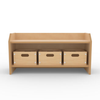 A soft curved bench follows a portion of the wall with cubbies for storage. An imaginative place for babies to explore and a soft floor mat too. Sensory items include our Flower Mirror, Sensory Log with creatures peering out, and our slider and hinged Learning Panels for cause-and-effect interactive activities. The wood provides a smooth, tactile quality for young babies.